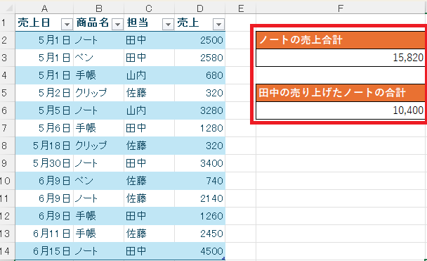 例えば、5月30日までのデータの入力では、ノートの売り上げは9180円、田中さんの売り上げたノートの合計は5900円でした。