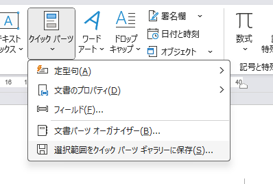 [挿入]タブ → [クイックパーツ] → [選択範囲をクイックパーツギャラリーに保存]
